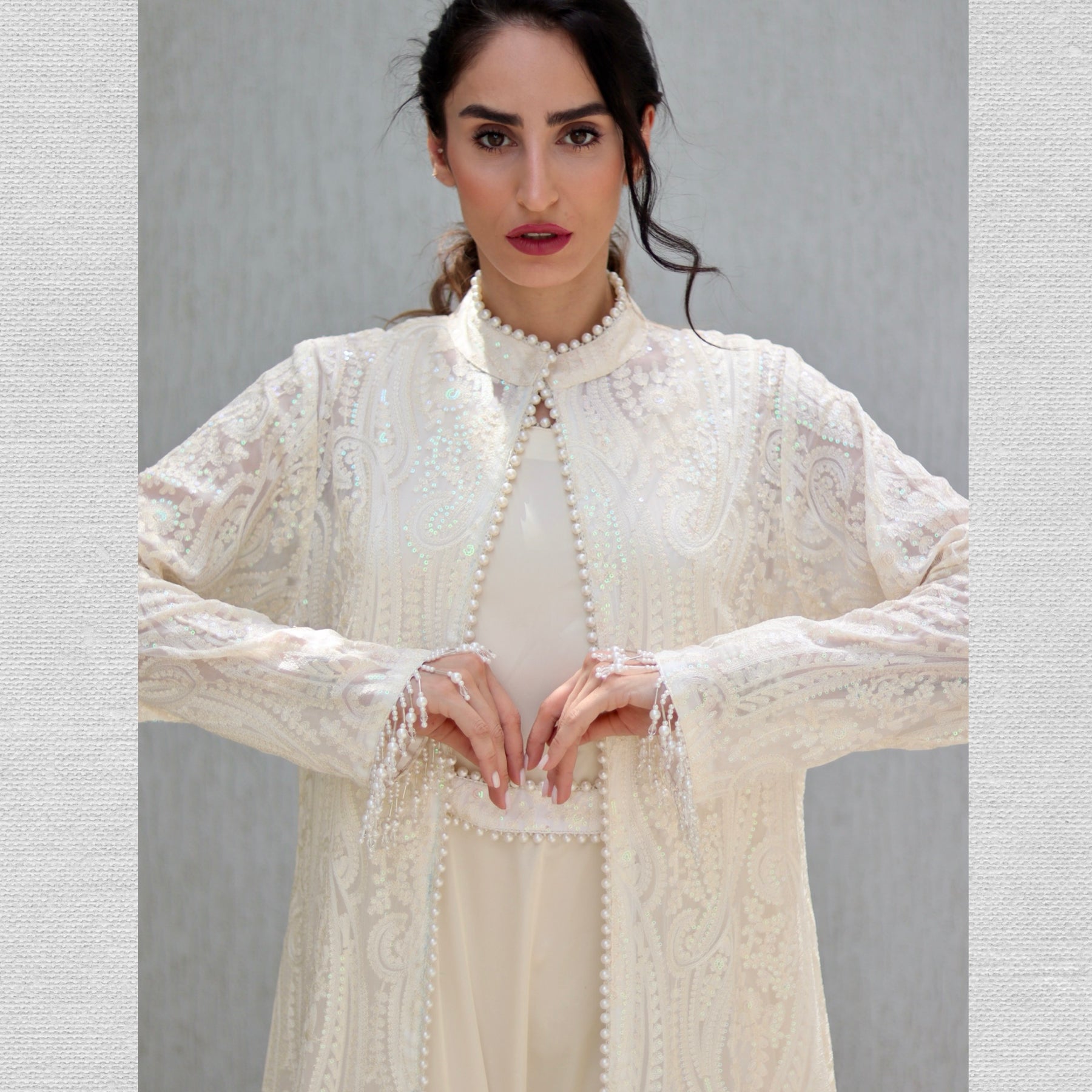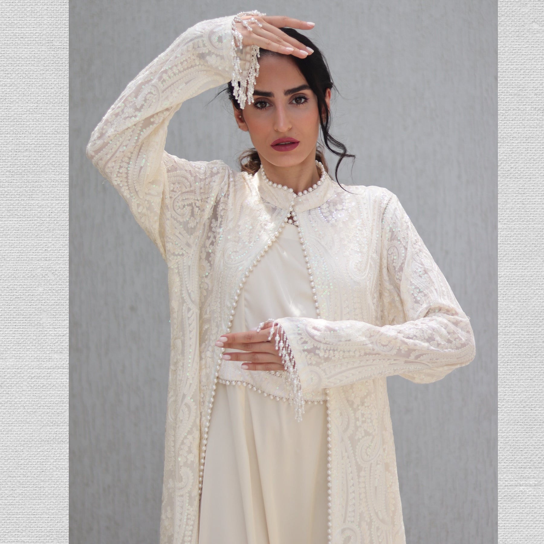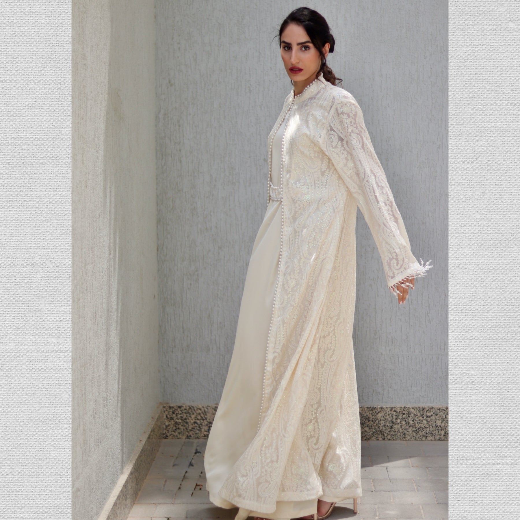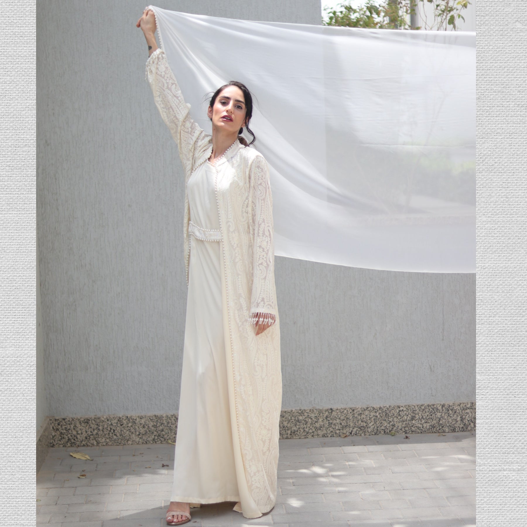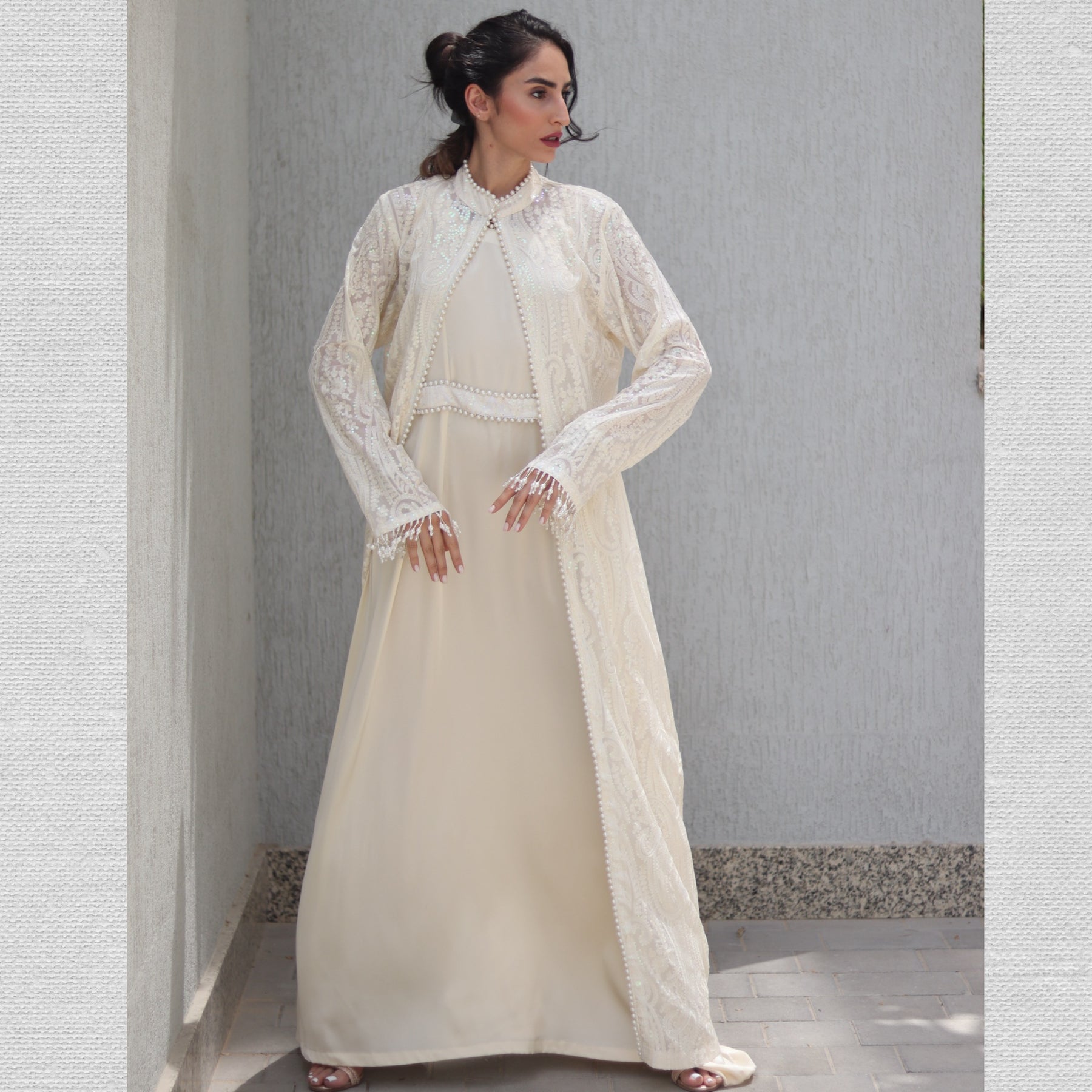 Style: Flowing and elegant, ideal for layering over the maxi dress to achieve a modest, yet regal Arab-style silhouette
