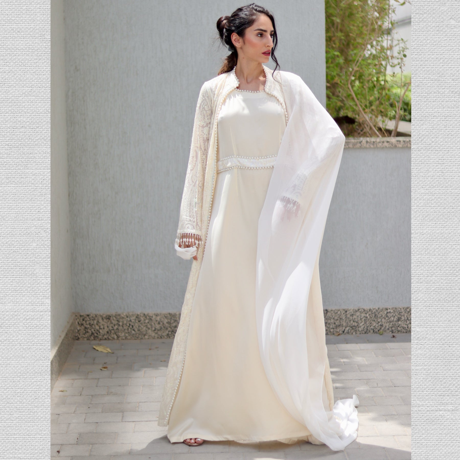 Arab Style Chikankari Cape & Satin Maxi Dress Set – 3-Piece Set (Cape + Maxi Dress + Scarf)