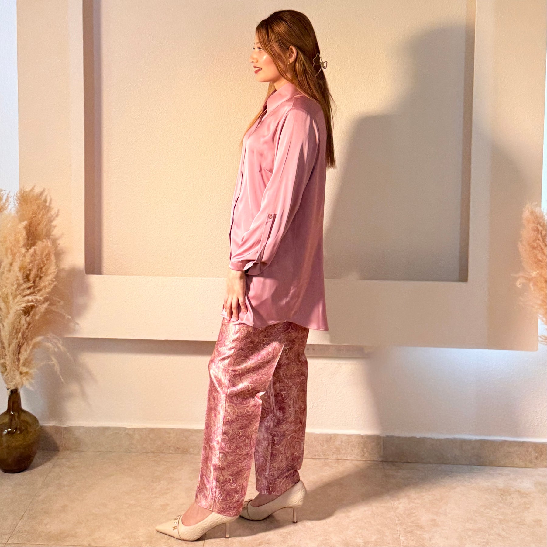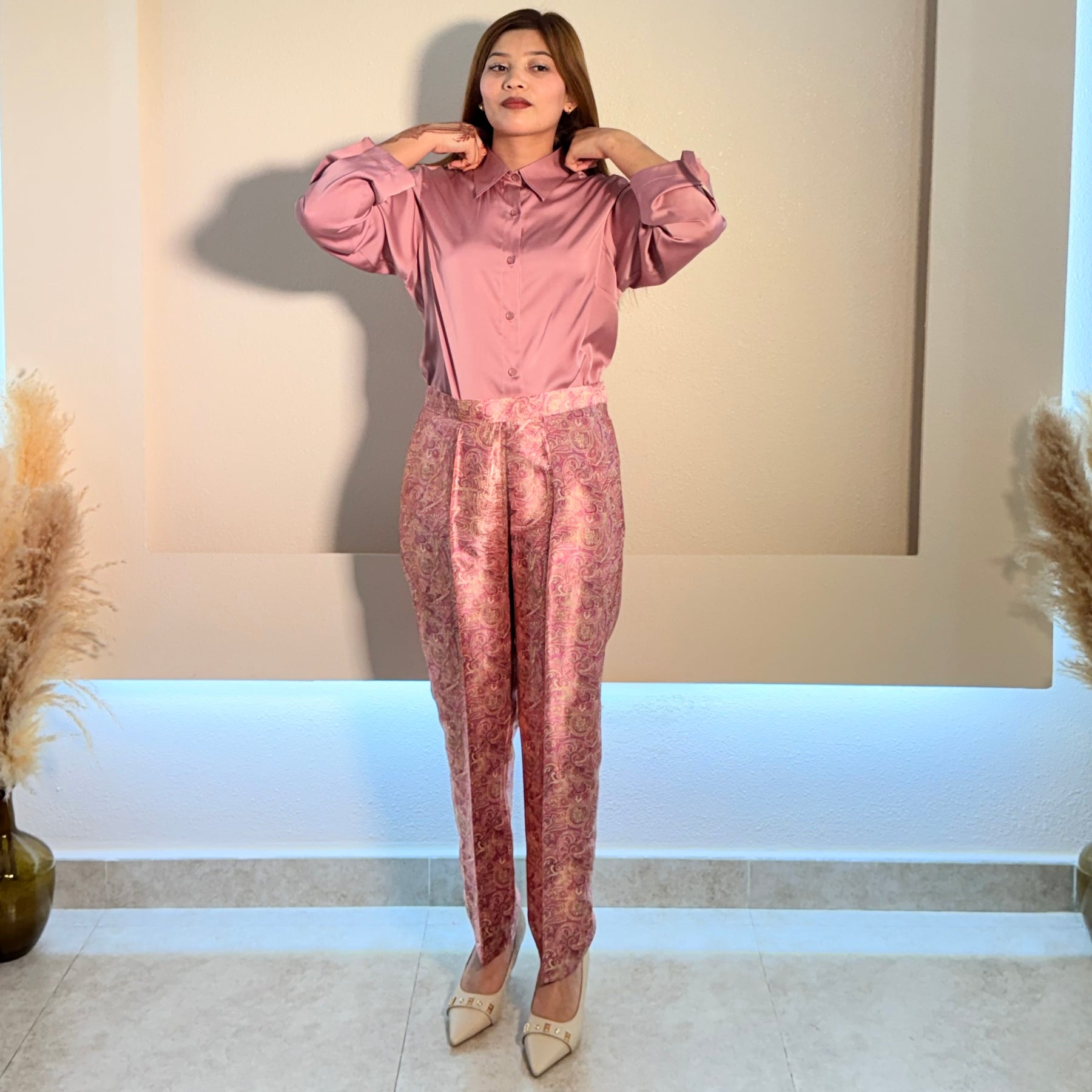 Paired with pure rod silk pants featuring a delicate butti design, side zip and hook closure, and a belted waist style, this outfit offers a flawless silhouette and unmatched comfort.