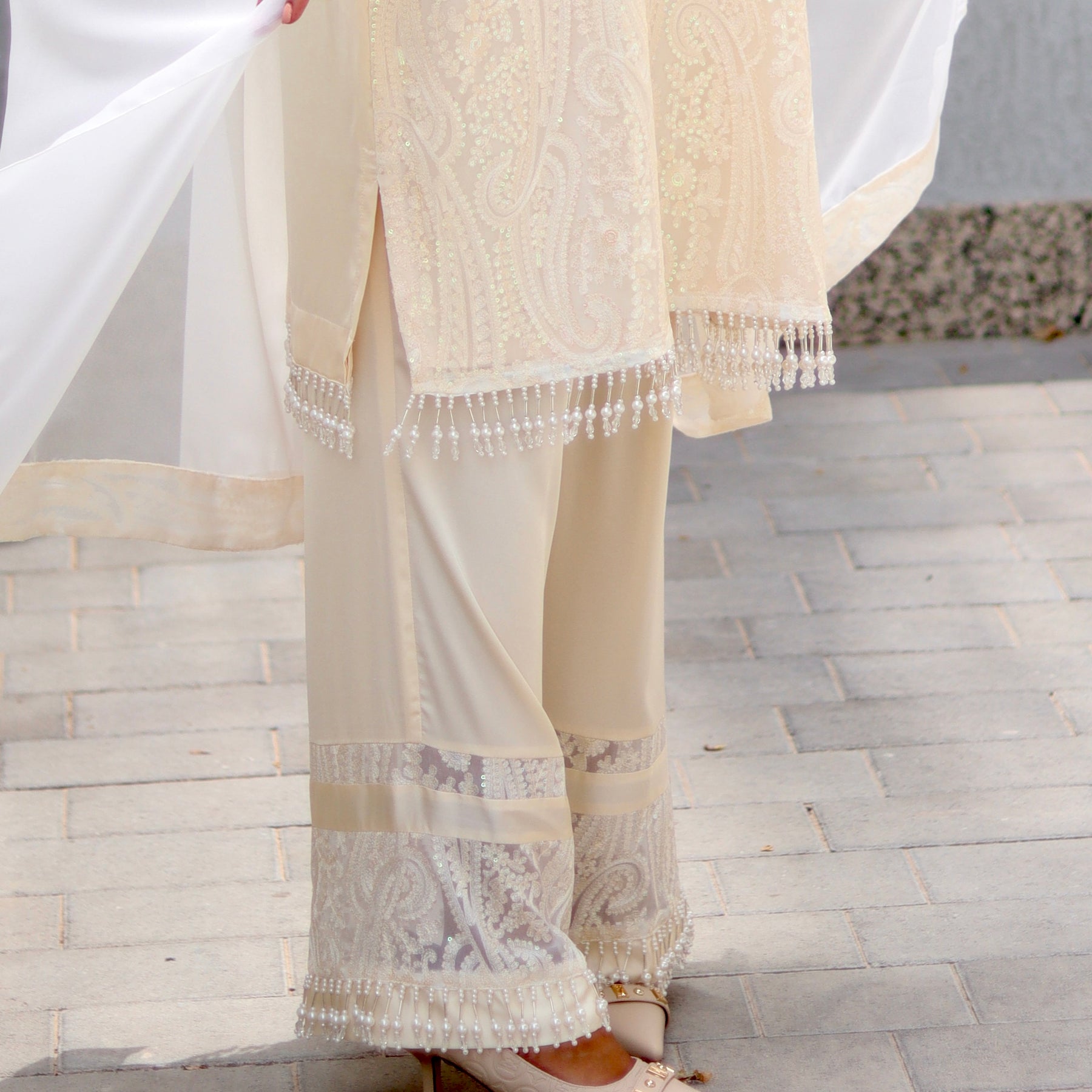 Elevate your wardrobe with this timeless cream 3-piece outfit, crafted in luxurious chiffon and adorned with intricate Chikankari embroidery highlighted by subtle rainbow sequins for a delicate shimmer.