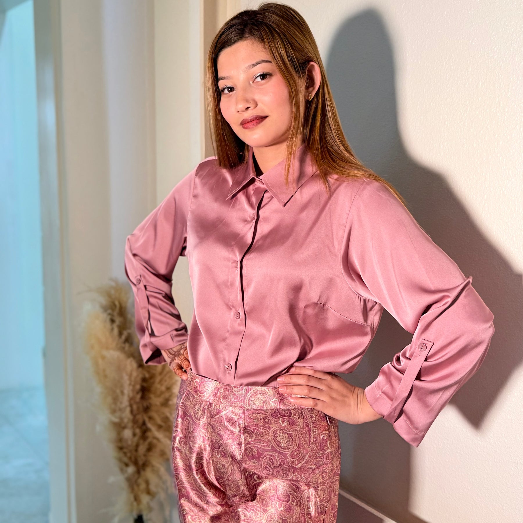 The stitched satin shirt features a luxurious sheen, simple button, and a relaxed yet refined fit, perfect for both day and evening wear.